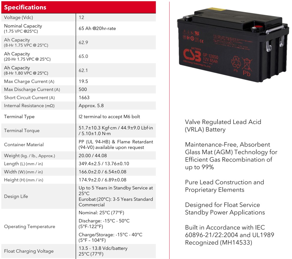 | Model Number | CSB GP12650 12V 65Ah | Battery | 12V 65Ah |
